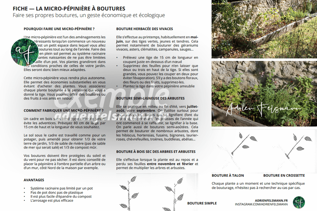 Le coaching jardin est sur-mesure. C’est vous qui choisissez le thème de la séance : association de légumes au potager, compostage, bouturage, greffe, récupération d’eau de pluie, bassins, ou des thématiques plus complexes comme la phytosociologie, l’étude des plantes bio-indicatrices, l’analyse de la structure d’un jardin. Je vous enseigne des outils et méthodes liés à la saison en cours à l’aide de plus de 60 fiches pédagogiques.